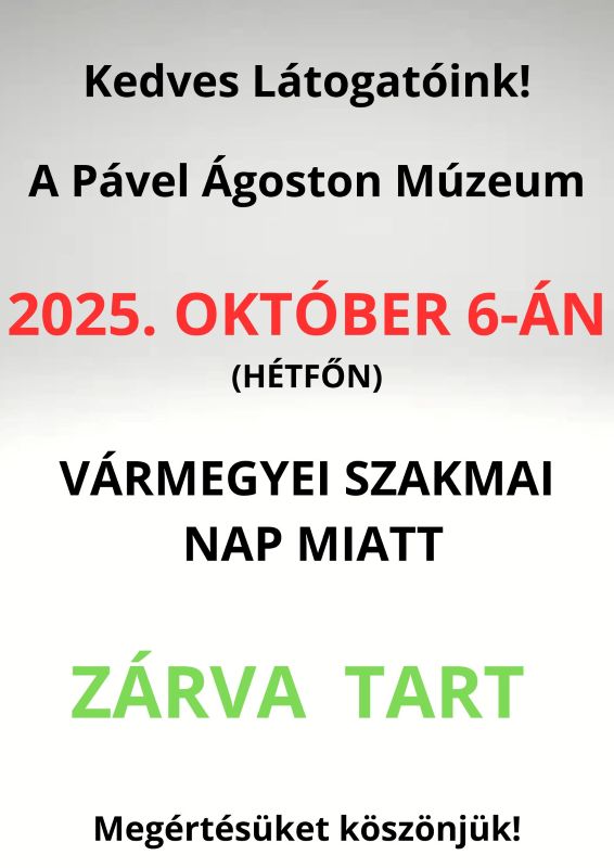 A Pável Ágoston Múzeum 2025. október 6-án vármegyei szakmai nap miatt zárva tart. Megértésüket köszönjük!