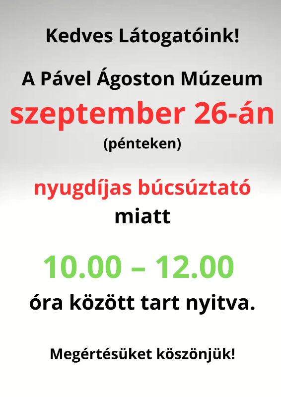 2025. szeptember 16-án (kedden) Pável Ágoston Múzeum 13.00 - 15.00 óra között tart nyitva.